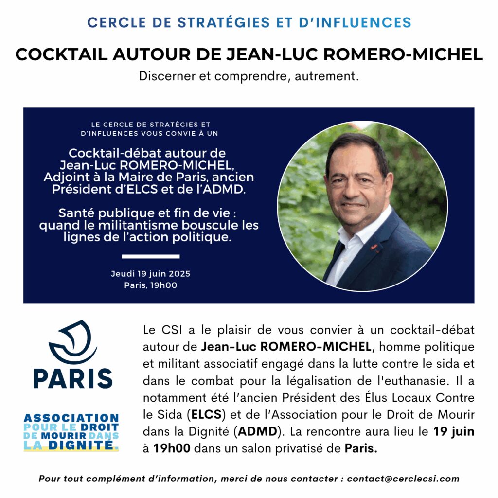 Le CSI – Cercle de Stratégies et d’Influences a le plaisir de vous convier à un cocktail-débat autour de Jean-Luc Romero – Michel, homme politique et militant associatif de premier plan, engagé de longue date dans la lutte contre le sida et dans le combat pour une législation plus humaine sur la fin de vie. La rencontre aura lieu le 19 juin 2025 à 19h00 dans un salon privatisé à Paris.