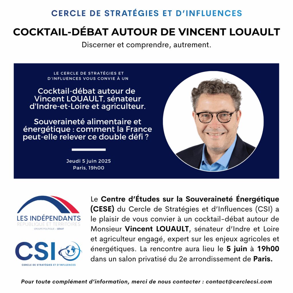 Le CESE – Centre d’Études sur la Souveraineté Énergétique du CSI a eu le plaisir de recevoir, lors d’un cocktail-débat, Vincent LOUAULT, sénateur d’Indre-et-Loire et agriculteur engagé. La rencontre a eu lieu le jeudi 5 juin 2025 dans un salon privatisé du 2ᵉ arrondissement de Paris. Animé par Adrien Guyot, directeur du Centre d’Études sur la Souveraineté Énergétique, cet échange entre notre invité et les membres du CSI portait sur la thématique suivante : « Souveraineté alimentaire et énergétique : comment la France peut-elle relever ce double défi ? »