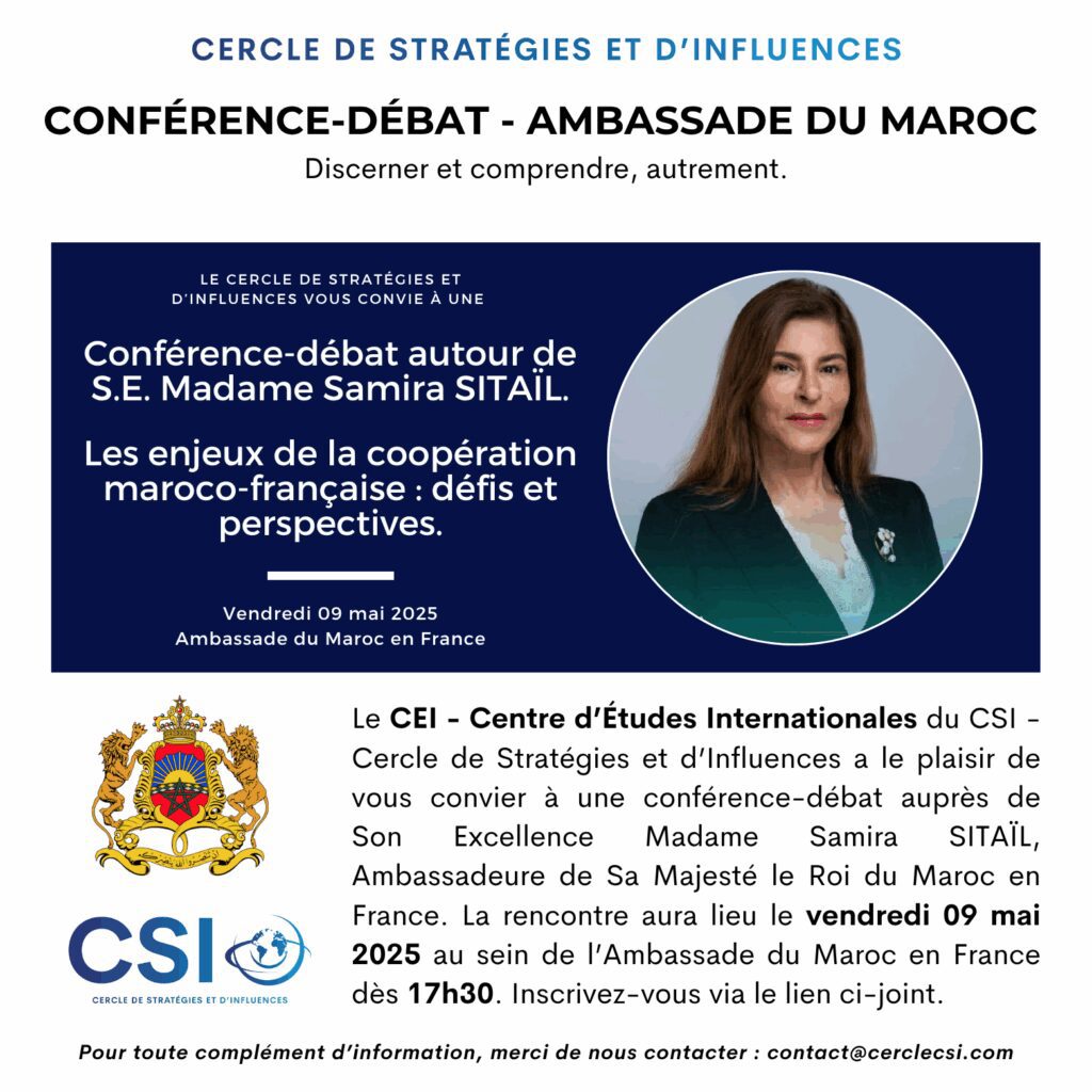 Dans la soirée du vendredi 9 mai, nous avons eu le plaisir d’être reçus à l’Ambassade du Royaume du Maroc en France, pour une conférence-débat entre membres, partenaires et sympathisants du CSI – Cercle de Stratégies et d’Influences.