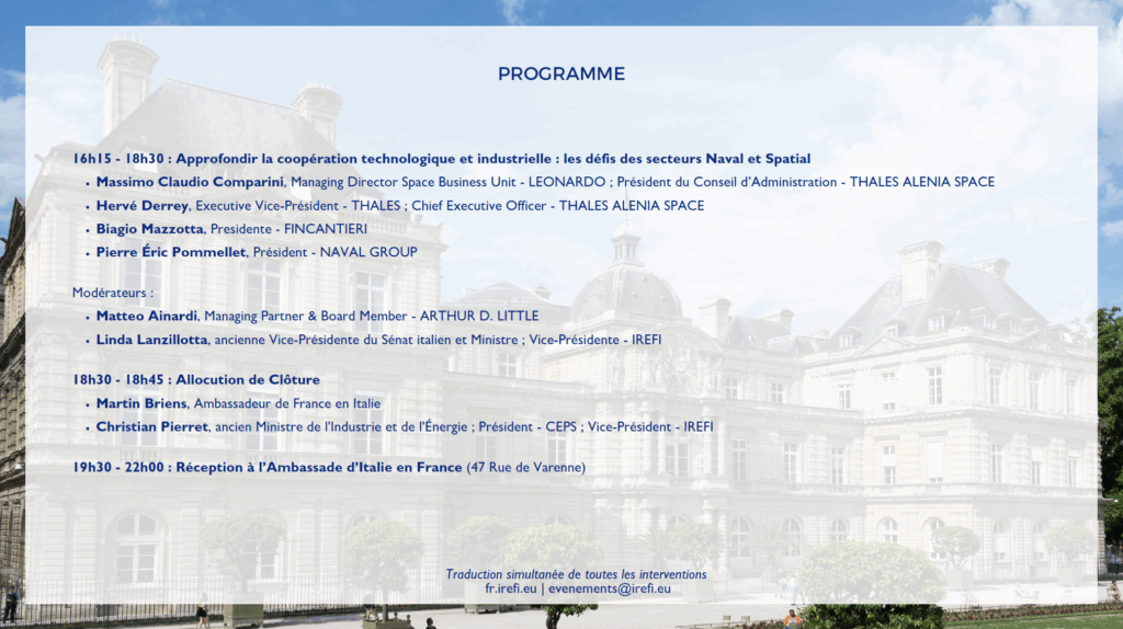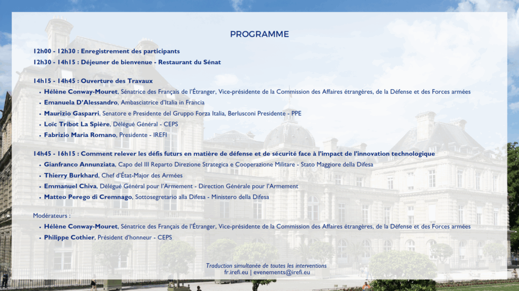 Cet événement était co-organisé par IREFI (Institut pour les relations économiques France-Italie) et le CEPS (Centre d’étude et de prospective stratégique), en collaboration avec le CSI (Cercle de Stratégies et d’Influences) et sur invitation de la Sénatrice Hélène Conway-Mouret, Sénatrice des Français de l’Étranger, Vice-présidente de la Commission des Affaires étrangères, de la Défense et des Forces armées.